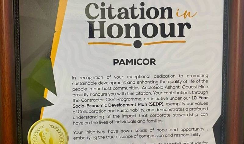 PAMICOR Limited has been recognised for its outstanding contribution to community development and corporate social responsibility, receiving a Citation in Honour at the AngloGold Ashanti Ghana, Obuasi Mine Contractor CSR Excellence Awards held on 12th December 2025.