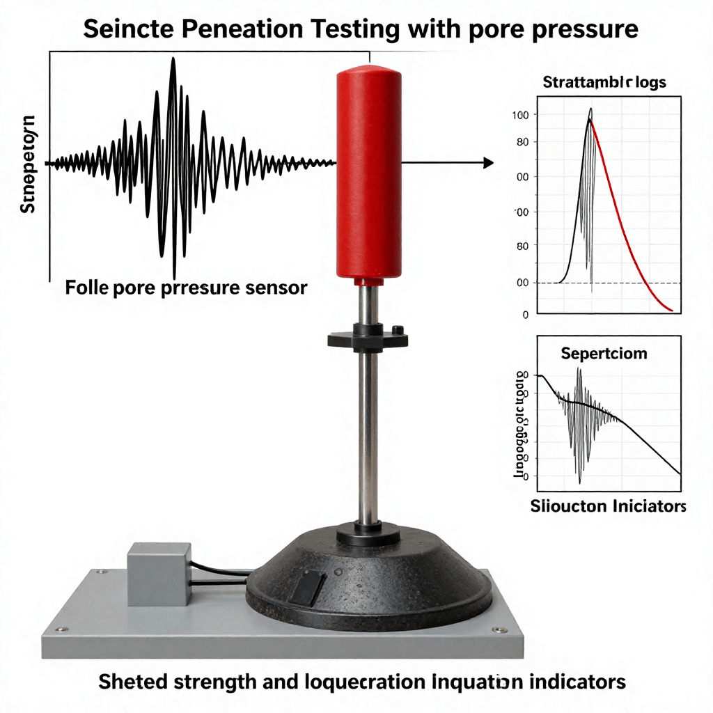 Seismic Cone Penetration Testing with pore pressure measurement for stratigraphy, shear strength, and liquefaction potential.